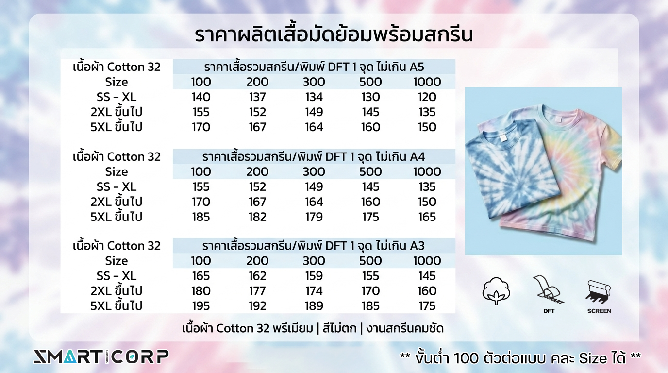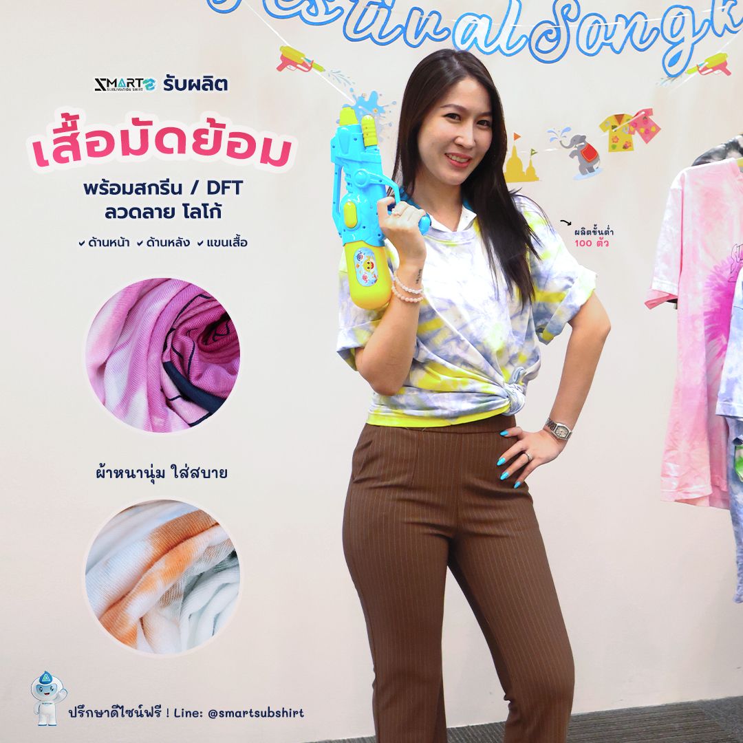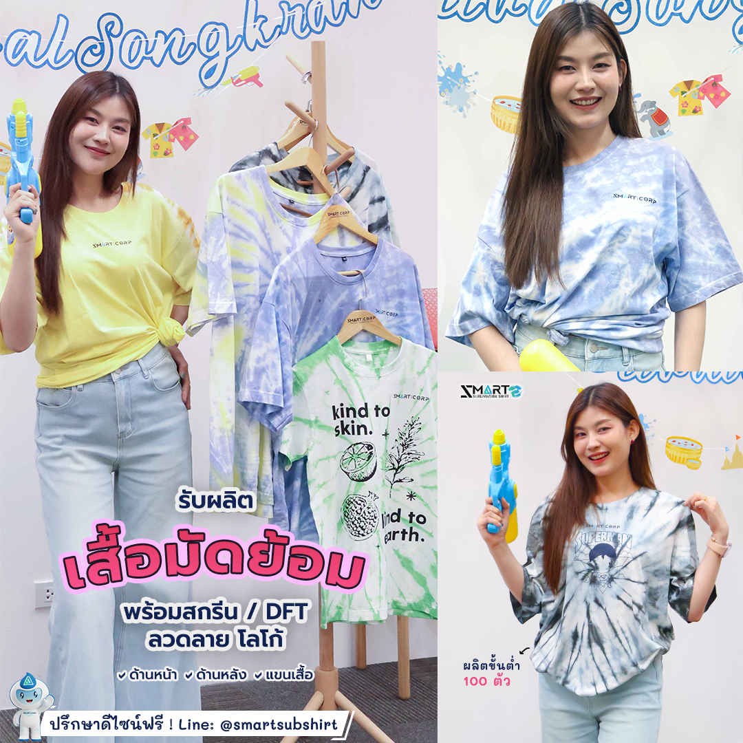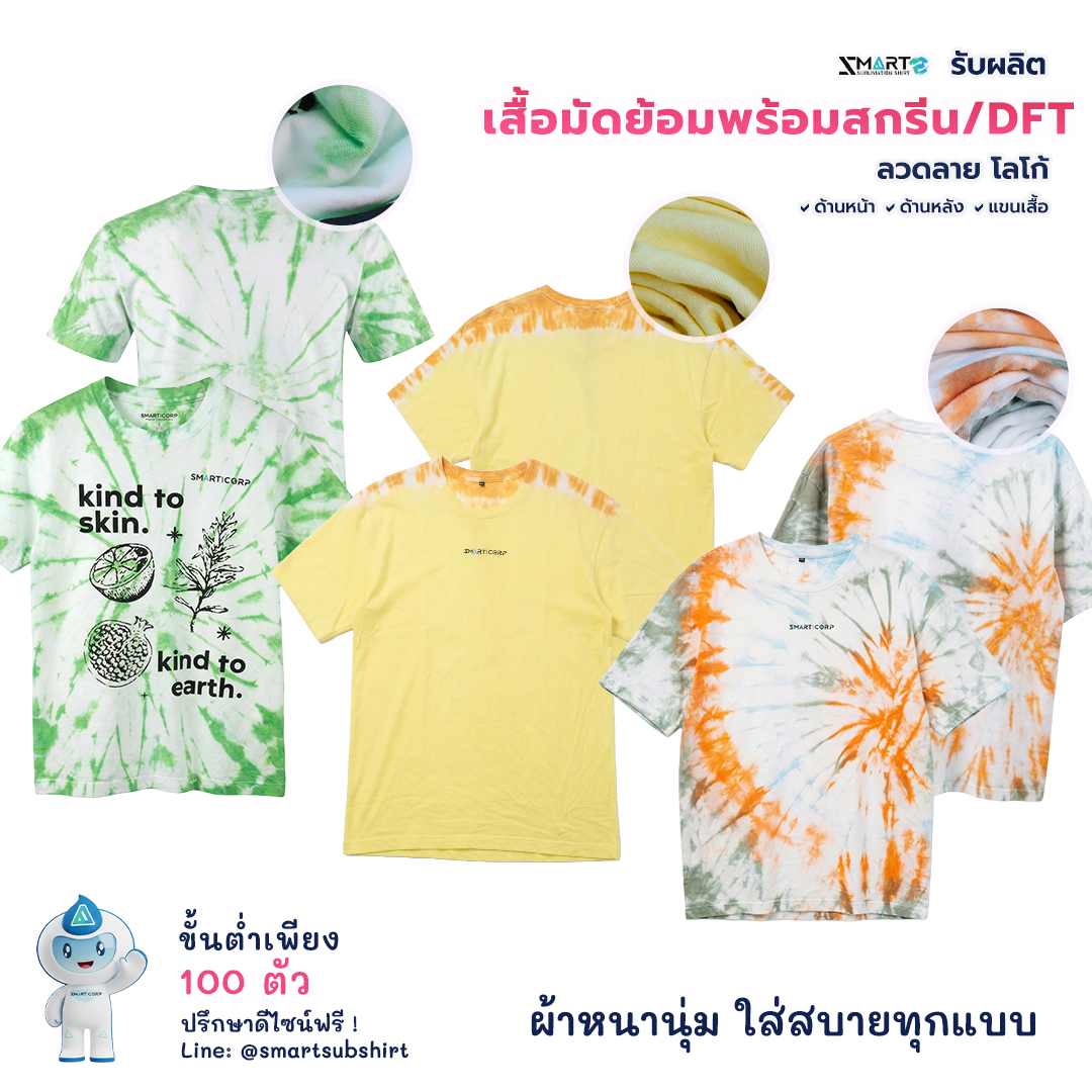 หากคุณกำลังมองหา โรงงานผลิตเสื้อมัดย้อม ที่ให้มากกว่าความสวยงาม แต่มาพร้อมกับคุณภาพงานสกรีน/ DFT ระดับพรีเมียม เราคือคำตอบ! บริการรับทำเสื้อมัดย้อมตามออเดอร์ พร้อมเทคโนโลยีการสกรีน และ DFT (Digital Film Transfer) โลโก้ ลวดลาย ที่ให้สีสันสดใส คมชัด และทนทาน เหมาะสำหรับเสื้อทีม, เสื้อกิจกรรม, เสื้อพนักงาน หรือผู้ที่ต้องการสร้างแบรนด์เสื้อผ้าของตัวเอง