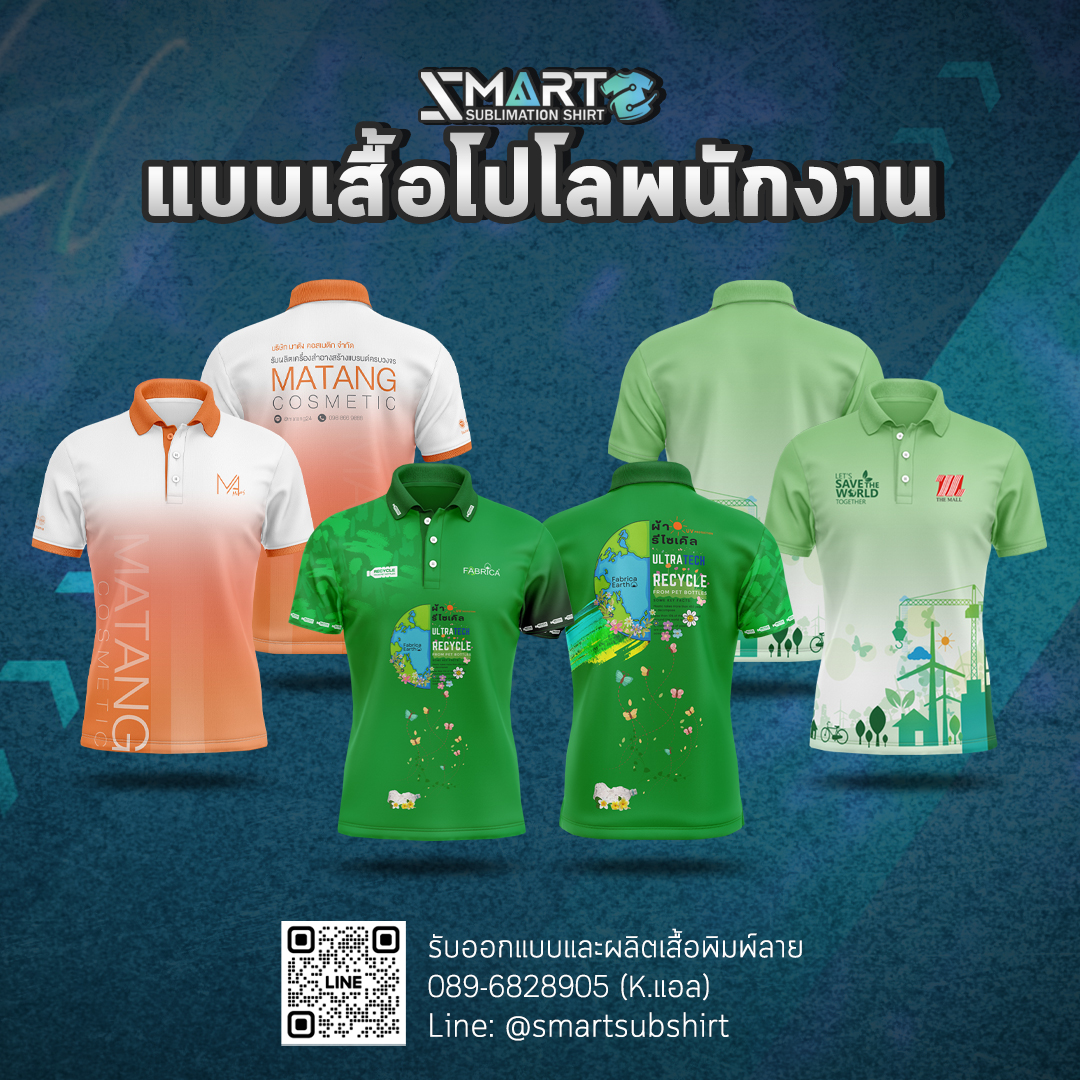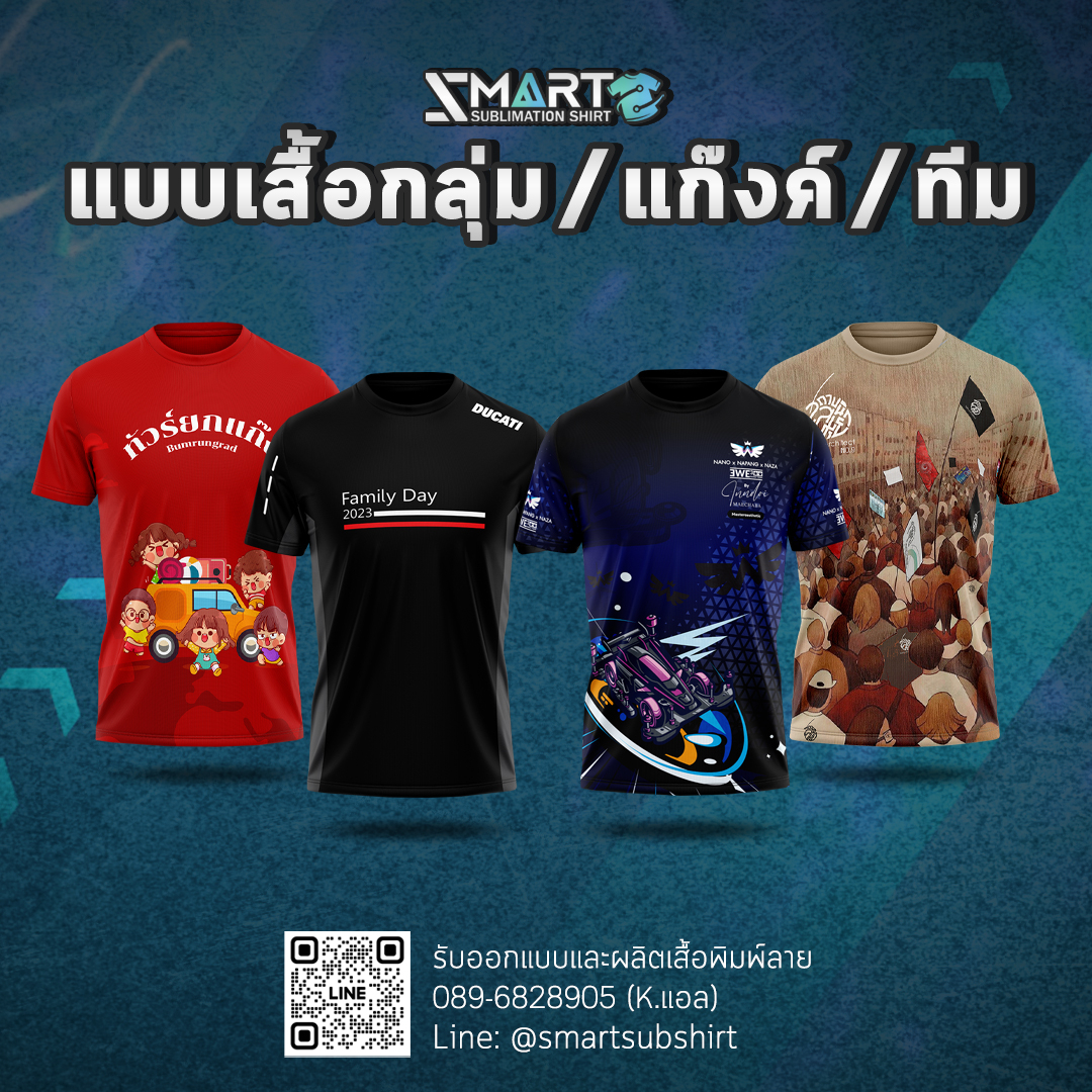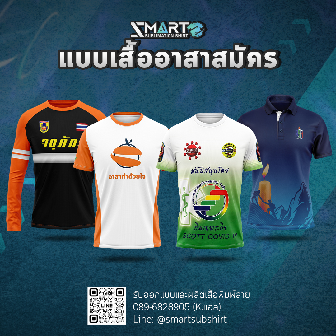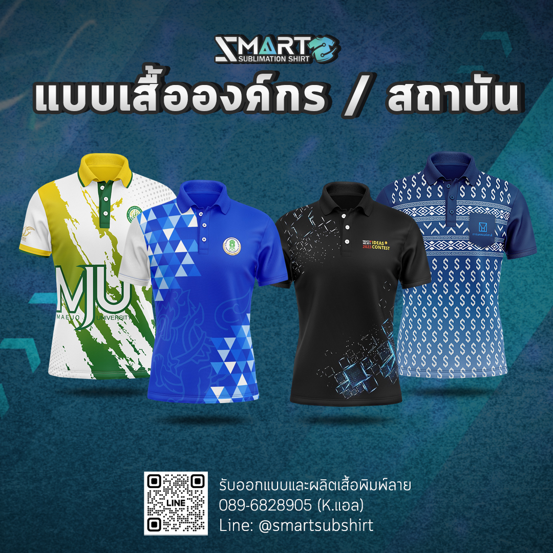 SMART SUBLIMATION SHIRT โรงงานรับออกแบบและผลิตเสื้อพิมพ์ลาย ครบวงจร เสื้อโปโล เสื้อคอกลม เสื้อคอจีน เสื้อคอวี เสื้อกล้าม เสื้อแขนยาว เสื้อแขนกุด แจ็คเก็ต เสื้อฮู้ด เสื้อเชิ้ต เสื้อฮาวาย งานพิมพ์คุณภาพคมชัด ตัดเย็บขึ้นใหม่ทุกตัว ออกแบบได้ตามต้องการ กำลังการผลิตสูง บริการครบวงจร จบงานได้ในที่เดียว มีสต็อกเนื้อผ้าให้เลือกผลิตกว่า 50 ชนิด งานพิมพ์ Digital Sublimation คุณภาพสูง ได้มาตรฐาน สั่งผลิต 50 ตัวขึ้นไป ออกแบบฟรี! ตัวอย่างงานออกแบบเสื้อ เนื้อผ้าแนะนำ! สำหรับผลิตเสื้อยืด เสื้อโปโล เสื้อแจ็คเก็ต เสื้อแขนยาว ดูเนื้อผ้าทั้งหมดของเรา >> ลูกค้าของเรา