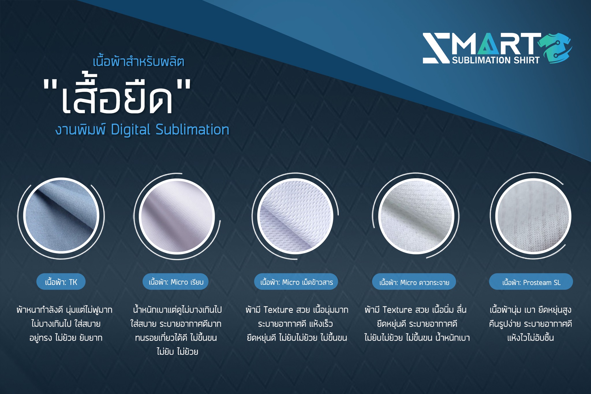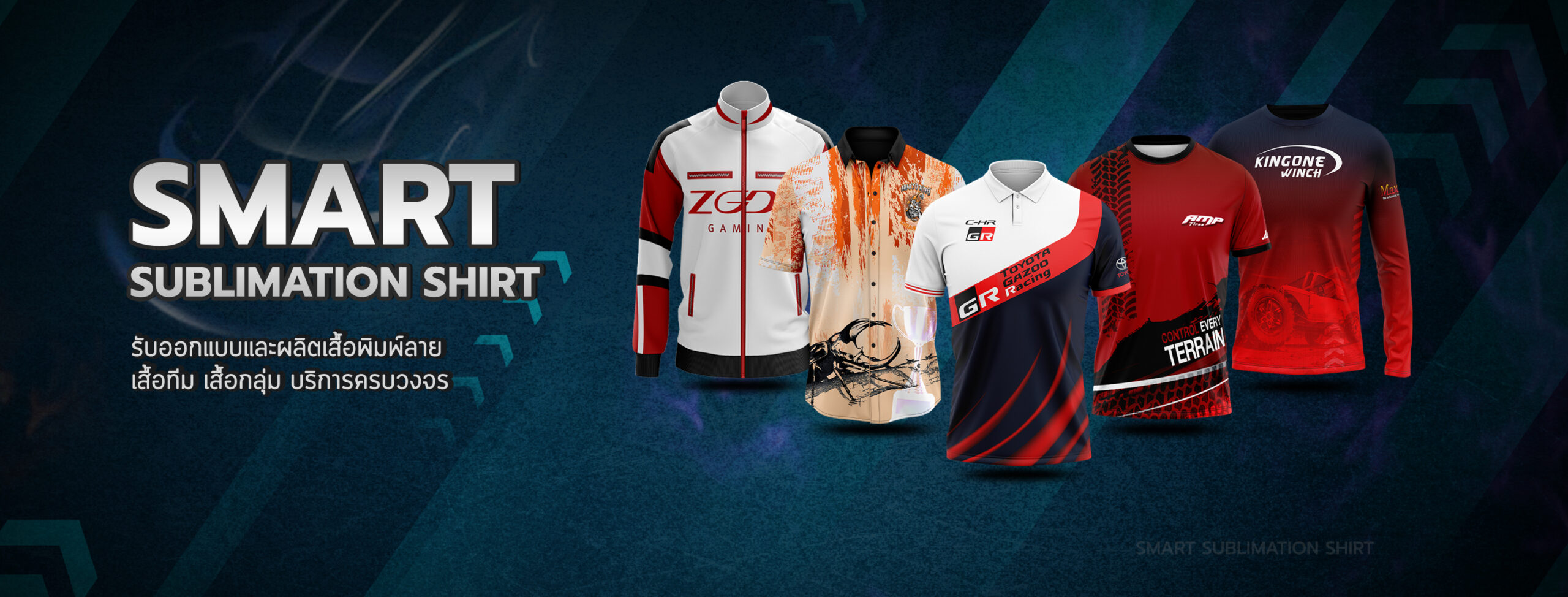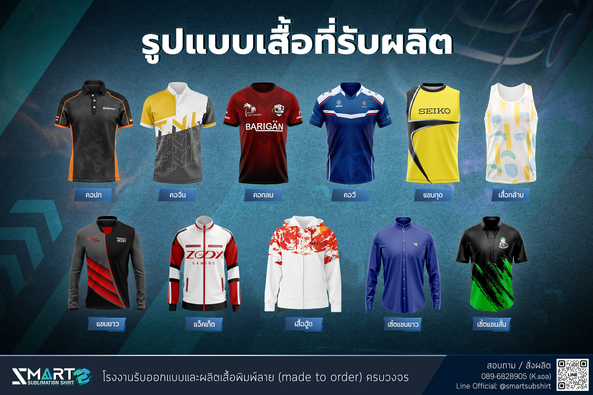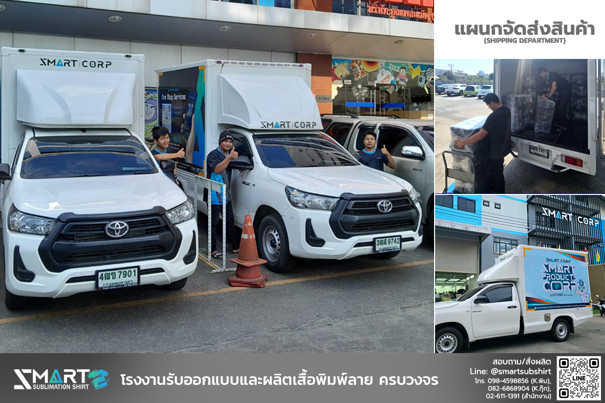 SMART SUBLIMATION SHIRT โรงงานรับออกแบบและผลิตเสื้อพิมพ์ลาย ครบวงจร เสื้อโปโล เสื้อคอกลม เสื้อคอจีน เสื้อคอวี เสื้อกล้าม เสื้อแขนยาว เสื้อแขนกุด แจ็คเก็ต เสื้อฮู้ด เสื้อเชิ้ต เสื้อฮาวาย งานพิมพ์คุณภาพคมชัด ตัดเย็บขึ้นใหม่ทุกตัว ออกแบบได้ตามต้องการ กำลังการผลิตสูง บริการครบวงจร จบงานได้ในที่เดียว มีสต็อกเนื้อผ้าให้เลือกผลิตกว่า 50 ชนิด งานพิมพ์ Digital Sublimation คุณภาพสูง ได้มาตรฐาน สั่งผลิต 50 ตัวขึ้นไป ออกแบบฟรี! ตัวอย่างงานออกแบบเสื้อ เนื้อผ้าแนะนำ! สำหรับผลิตเสื้อยืด เสื้อโปโล เสื้อแจ็คเก็ต เสื้อแขนยาว ดูเนื้อผ้าทั้งหมดของเรา >> ลูกค้าของเรา