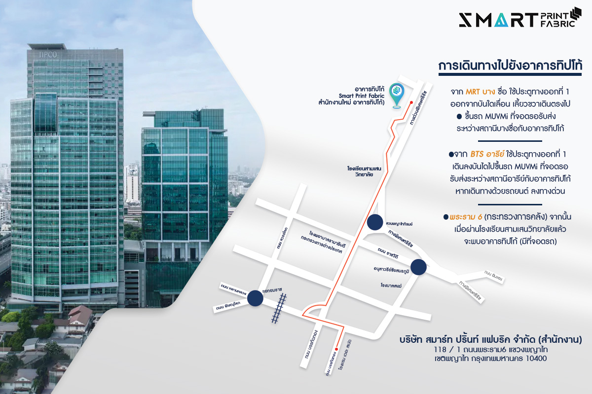 (สำนักงานใหญ่)บริษัท สมาร์ท ปริ้นท์ แฟบริค จำกัดชั้น 17 อาคารทิปโก้ ทาวเวอร์ เลขที่ 118/1 ถนนพระราม 6 แขวงพญาไท เขตพญาไท กรุงเทพฯ 10400 Smart Print Fabric Co.,Ltd.Tipco Tower, 17th Floor, 118/1 Rama 6 Road, Phaya Thai, Bangkok 10400, Thailandโทร. 098 – 4598856 (คุณพิม), 082 – 6868904 (คุณกุ๊ก), 02-611-1391 (สำนักงาน)E-mail: sales@smartsublimationshirt.com (โรงงาน)บริษัท สมาร์ท ปริ้นท์ แฟบริค จำกัด96/105-106 หมู่ที่ 8 ซอยวัดคู่สร้าง ถนนสุขสวัสดิ์ ตำบลในคลองบางปลากด อำเภอพระสมุทรเจดีย์ จังหวัดสมุทรปราการ 10290 Smart Print Fabric Co.,Ltd.96/105-106 Moo 8 Tumbol Naikhlongbangplakod Phrasamutchedi Sub-district Samutprakarn Province 10290